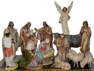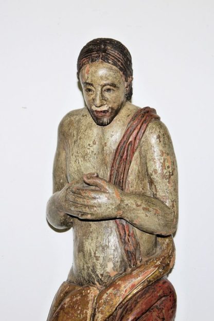 Jesus im nackten Oberkörper, mit einer über seine linke Schulter geworfenen Stoffbahn, die in die üppigen Falten seines Lendenschurzes übergeht, kniet mit dem linken, nackten Bein auf einem Felsen, dabei die Hände gefaltet. Der Kopf ist mit in sich gekehrtem Blick nach unten gerichtet. H 65 cm, Lindenholz mit in großen Teilen erhaltener, originaler Fassung. Aus einer zweiteiligen taufgruppe mit Johannes dem Täufer. Dargestellt ist der innige Moment kurz vor Christi Einstieg in den Jordan. Beiliegend die Teile einer wohl sekundären Mandorla.