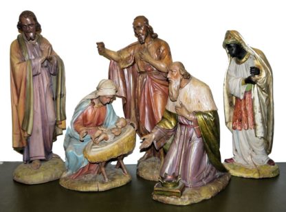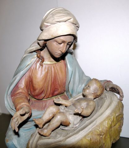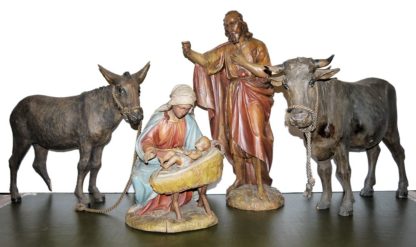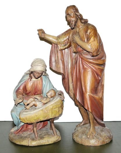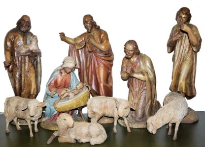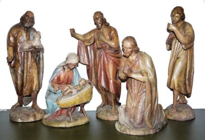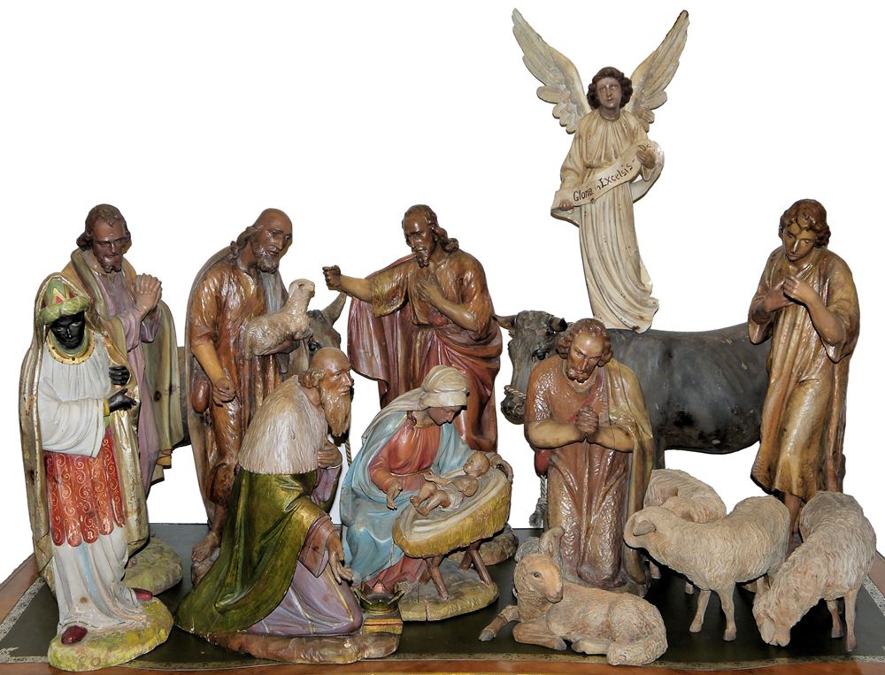 15 Krippenfiguren bis zu der spektakulären Größe von 62 cm, meisterhafte und ausdrucksstarke Schnitzarbeiten mit farbiger Fassung, dabei Maria mit Jesusknaben in Krippe (H 38 cm), Joseph (H 60 cm), drei Hirten (H 45, 60 & 62 cm), den Hl. Drei Königen (H 43, 54 u. 61 cm), einem Engel (H 45 cm), vier Schafen (H 13 - 21 cm), Ochs (H 45 cm) und Esel (H 46 cm), z.T. mit altersbedingten Schwundrissen, Hand eines Hirten geklebt, Finger des Joseph gechipt, ein Hinterlauf des Esels beschädigt (aber steht stabil)