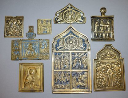 Acht orthodoxe Bronze-Ikonen, Teile bzw. Fragmente, Russland 17.-19. Jh. Frühe Ikone mit Deesis und vier Heiligen (9 x 6 cm), Muttergottes vom Zeichen mit den Symbolen der vier Evangelisten, Aufhängung abgebrochen (6 x 5,4 cm), "Pokrov", Gottesmutter breitet ihren Schutzmantel aus (12 x 8 cm); ein Flügel einer Festtagsikone, emailliert (17,7 x 10 cm), Triptychon, emailliert (9,2 x 10,4 cm); Gottesmutter mit Schriftstück (7,5 x 6,5 cm), Bogenfeld einer Ikone (5,6 x 8,7 cm sowie kleine Ikone (4,2 x 4 cm), Teile bzw. nicht vollständige Stücke
