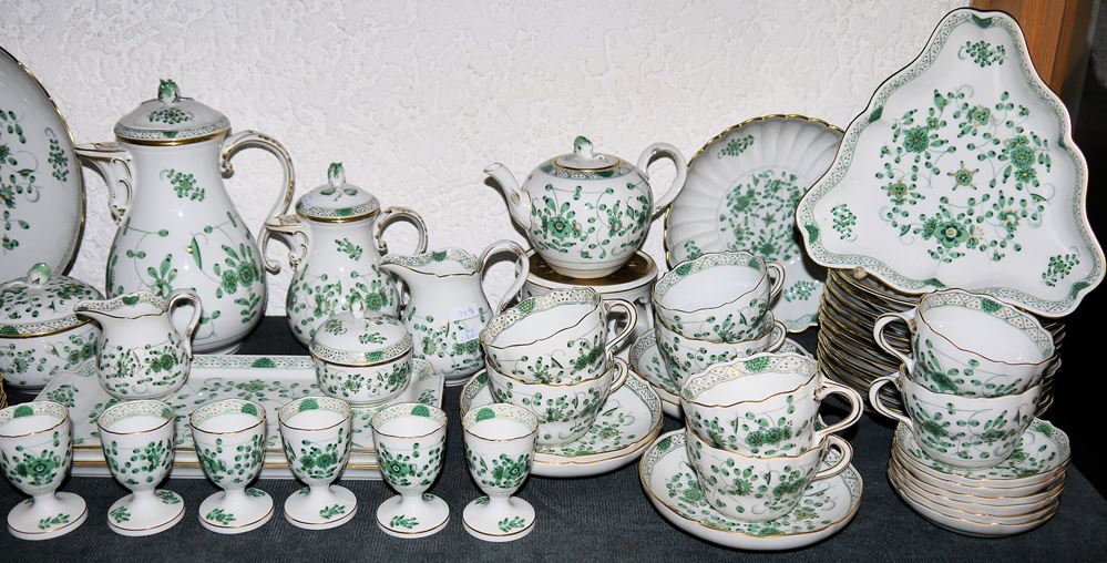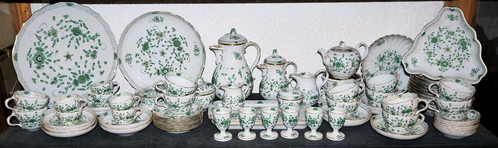 74 tlg.: 12 Kaffeetassen auf 12 Untertassen, 12 Kuchen-/Frühstücksteller, Kaffeekanne, Milchkännchen und Zuckerdose, kleine Teekanne, Mokkakanne, 6 Mokkatassen auf 6 Unterteller, 6 kleine Kuchenteller, Sahnekännchen u. Zuckerdose, 2 rechteckigen Tabletts/Platte, gefußte runde Tortenplatte, großer runder Gebäckteller, kleiner runder Gebäckteller mit gerippter Fahne, dreieckiger Gebäckteller, Stövchen, Butterdose und 6 Eierbecher, indische Malerei in Grün, Goldrand, Schwertermarke, dazu 2 x passende Servietten