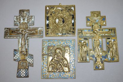 Zwei orthodoxe Segenskreuze und zwei Ikonen aus Bronze, Russland 18./19. Jh. Erweitertes Segenskreuz (16,9 x 11 cm) und weiteres Segenskreuz (19,8 x 11,4 cm), Ikone vom unverbrennbaren Dornbusch (9,5 x 9 cm) sowie Ikone der Gottesmutter im Rosenhag (10,9 x 9,4 cm), alle Bronze mit Emaillierung