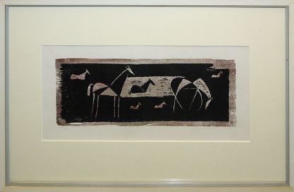 Ewald Mataré, 1887 Burtscheid - 1965 Büderich, Pferde auf der Weide (Fünf, eigentlich sieben Pferde), Farbholzschnitt, 12,5 x 33,5 cm, signiert, nummeriert 69/250, heller Wasserfleck, oben rechts Knickfalte, Blattrand mit Einrissen, im Passepartout gerahmt. Literatur: Peters 239 - Mataré/de Werd 328
