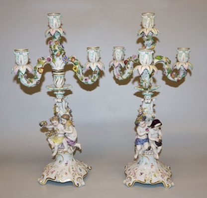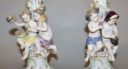 Paar dreiarmige Leuchter mit vier Kerzenhaltern, figürlicher Schaft mit je zwei Jahreszeiten-Allegorien (Frühling & Sommer/ Herbst & Winter als Putten), Rocaillen u. aufgelegte Blumen auf ansteigendem Fuß und Rocaillenstützen, Oberteil abnehmbar, geschwungene Arme mit aufgelegten plastischen Blüten und Früchten, Modell-Nr. E 128/ E 129, Entw. Ernst August Leuteritz 1855-1863, H ohne Aufsatz 34 cm, mit Aufsatz 49,5 cm, Schwertermarke, sehr guter Zustand