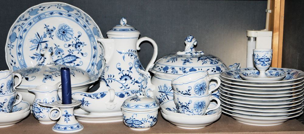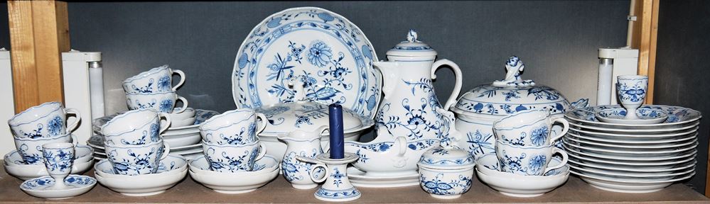 46 Teile: 10 Tassen auf 10 Untertasse, 11 Kuchen-/Frühstücksteller, Kaffeekanne, Milchkännchen und Zuckerdose, 2 Eierbecher, dazu Einzelleuchter, Suppenterrine, runde Deckelterrine, runde Schüssel, Sauciere, 3 Speiseteller und 2 Suppenteller, Blaumalerei, Schwertermarke, die beiden Terrinen und Schüssel 2. Wahl, alle anderen 1. Wahl