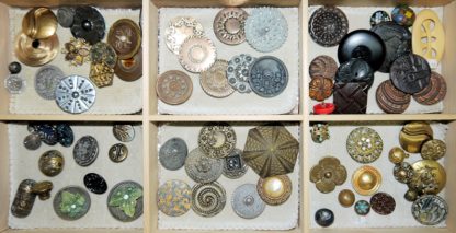 Messing/ Kupfer/ Metall, vergoldet, im Relief, durchbrochen und ziseliert, verschiedene Größen, u.a. Uniformknöpfe, einmal mit Miniaturmalerei hinter Glas, Darstellung Kutsche, Segelboot u.a., kugelige Knöpfe mit Türkisbesatz, dazu Papiermaché-Knöpfe mit Federn, Heißluftballon u.a.
