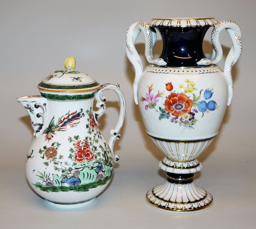 Amphorenvase aus Porzellan mit gewundenen Schlangenhenkeln und polychromer Blumenmalerei, Schwertermarke 1. Wahl, H 22,5 cm sowie Birnkanne im Meißner Stil, bemalt mit chinesischen Motiven, ungemarkt, H 18 cm