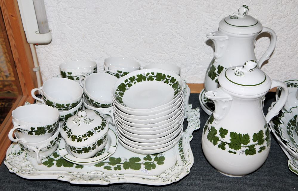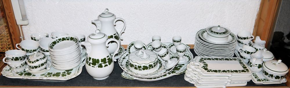 Umfangreiches Kaffee- und Frühstücks-Service Weinlaub, Meißen, überwiegend 1. Wahl 71 Teile: 12 Kuchen-/Frühstücksteller, 12 Kaffeetassen auf 12 Untertassen, 2 Kaffeekannen, einmal Untersetzer, 4 Mokkatassen auf 4 Untertassen, Butterdose, Käseteller mit Haube, runde Gebäckschale, ovales Tablett/Platte, längliches Tablett/Kuchenplatte, 2 Sahnekännchen, kleine und große Zuckerdose, 6 Eierbecher, 6 Brettchen, quadratisches Tablett mit Handhaben, vierpassige Deckeldose und runder Aschenbecher, Schwertermarke, überwiegend 1. Wahl, 1 x einfache, 1 x doppelt und 13 x dreifach durchschliffen, 1 kl. Randchip an Tasse, 1 x Randchip an Untertasse