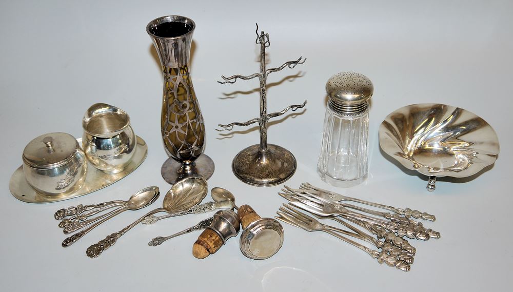 925er Silber: Sahnekännchen u. Zuckerdose auf Tablett, Baum als Schmuckständer, H 19 cm, zus. 330 g; 830er Silber: Runde Zierschale mit ausladender godronierter Wandung auf Rocaillefüßen, Dm 13 cm; Zuckerstreuer-Montur, Korpus aus facettiertem Klarglas, H 12,5 cm und 2 Flaschenstopfen, zus. mind. 130 g (ohne Stopfen); 800er Silber: Glasvase mit Silbermontur, H 18,5 cm; 9 Kuchengabeln, Zuckerzange, Sahnelöffel, 2 Mokkalöffel mit Rosengriffen, dazu 3 weitere Mokkalöffel, zus. 278 g (ohne Vase)