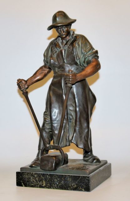 Johann Friedrich Reusch, 1843 Siegen - 1906 Girgenti/ Sizilien, deutscher Bildhauer und Hochschullehrer in Königsberg, hier: Siegerländer Hüttenwerker, Bronze mit brauner Patina, auf Marmorsockel, H 39, 5 cm, auf der Plinthe sign. u. bez. Königsberg.