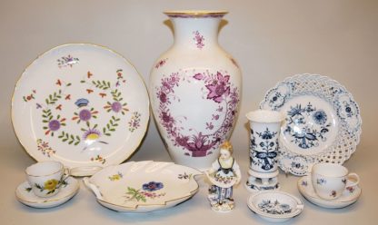 Gärtnerkind, Mädchen mit Blumen in Schürte, Modell-Nr. 60311, H 12 cm, ein Finger geklebt; runde Platte mit chinesischer Blumenmalerei, Goldrand, Dm 27,5 cm; Blattschale mit polychromer Blumenmalerei, Goldrand, L 22 cm; 2 Mokkatassen auf Untertasse Gelbe Rose und Streublumen; 3 x Zwiebelmuster: Zierteller mit durchbrochenem Rand, Dm 20,5 cm, Vase, H 14,5 cm und runder Ascher, Dm 9,3 cm, alle mit Schwertermarke, eine Mokkatasse mit Untertasse und Vase 2. Wahl, dazu große Vase Aponnyi Rot, H 33 cm, Stempelmarke