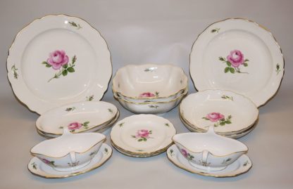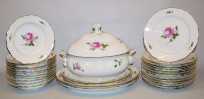 42 Teile: 12 Teller, 12 Suppenteller, 3 Beilage-Teller, vier große ovale und 2 runde Platten, 2 runde und 2 viereckige Schüsseln, 2 kleine ovale Schüsseln, 2 Saucieren und große ovale Suppen-Terrine, Goldrand, rosafarbene Rosen in feiner Malerei, Schwertermarke, doppelt durchschliffen
