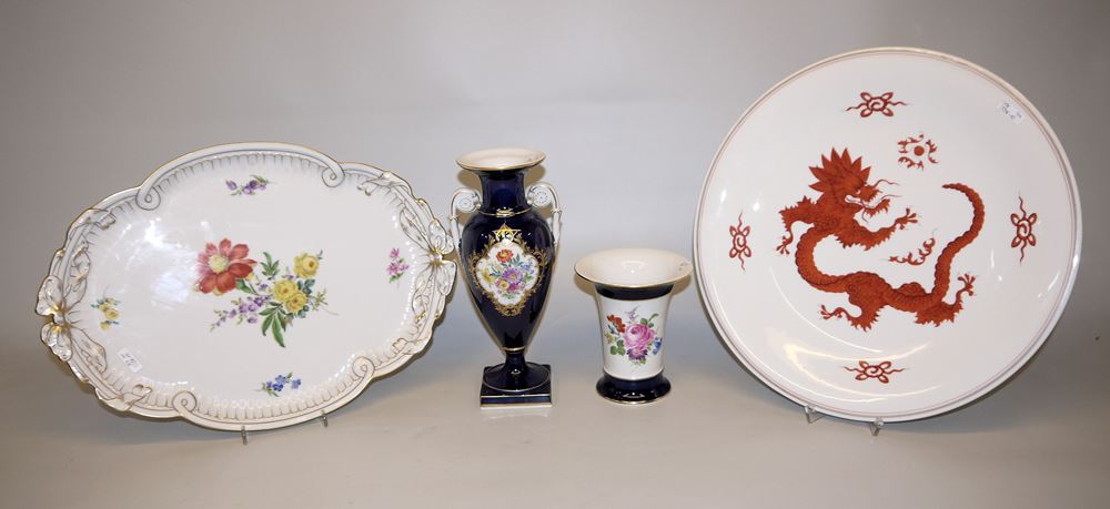 Große Zierschale mit Rotem Drachen (Dm 35,5 cm), Platte mit polychromem Blumenbukett und goldgehöhtem Rand (28 x 39,5 cm), Amphore (H 25,5 cm) und Trompetenvase (H 14 cm), beide Kobalt mit polychromen deutschen Blumen, alle einwandfrei, Schwertermarken alle 1. Wahl