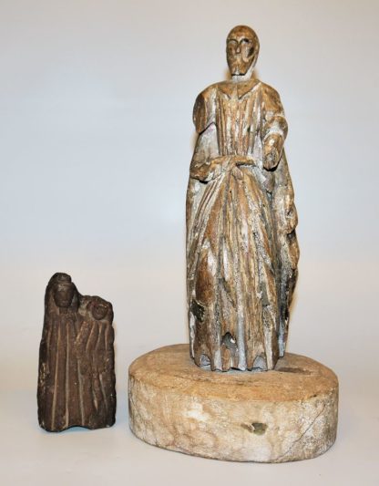 Eine größere weibliche und eine kleinere Person in langen Faltengewändern stehen eng aneinander gedrängt frontal zum Betrachter gerichtet, Steinskulptur mit rückseitig ungedeuteten Schriftzeichen und der Datierung 1771, H 12,5 x 6,0 x 4,0 cm. Unserer Einschätzung nach handelt es sich stilistisch um eine osteuropäische Arbeit um 1600. Die ungedeuteten Schriftzeichen erscheinen uns hierbei deutlich älter als das Datum 1771. Möglicherweise handelt es sich hierbei um ein sekundäres Stifterdatum // Stehende männliche Figur eines bärtigen Mannes im langen Faltengewand mit hochgegürtetem Umhang und einem Spitzkragen der Zeit um 1680/1700, Arme fehlend, Ergänzungen am Hinterkopf, montiert auf einfachem alten Holzsockel, H 28 cm