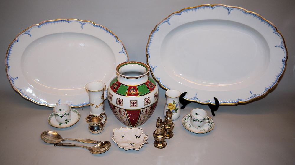 Zwei Vasen mit Gelber Rose und Gelbem Drachen, 11/ 14,5 cm, Meißen, Schwertermarke, 1. Wahl, Fußchip an einer Vase; Blattschale, Höchst, L 14 cm; paar Mokkatassen Weinlaubdekor auf Untertassen Herend; Vase mit Dekor "Semperoper Dresden", Hutschenreuther, H 22 cm, dazu zwei große ovale Bratenplatten, Goldrand mit blauem Dekor um 1900, L 45,5/ 49 cm; Salz-und-Pfeffer-Streuer, 925er Silber, Füße gefüllt, H 11,5 cm; Sahnekännchen 925er Silber, H 7 cm; paar Servierlöffel 830er Silber Christian F. Heise Copenhagen 1930 und Zigarettendose 900er Silber, 3,5 x 14 x 11 cm