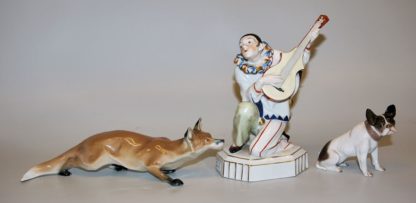 Drei Sammler*Innen-Porzellane: Pierrot mit Gitarre von Hertwig & Co., schleichender Fuchs von Meißen und französische Bulldogge von Rosenthal