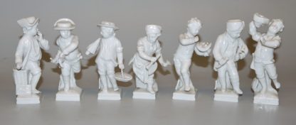 Sieben Zodiak-Figuren, KPM Berlin 20. Jh. Entwurf Friedrich Elias Meyer um 1775, Sieben Knaben bei verschiedenen Tätigkeiten, Weißporzellanfiguren aus einer Serie der Sternzeichen, auf kleinen Tafeln am Sockel kenntlich: Steinbock, Schütze, Widder, Krebs, Löwe, Waage und Zwillinge, alle Zeptermarke mit Punkt, H ca. 11 cm