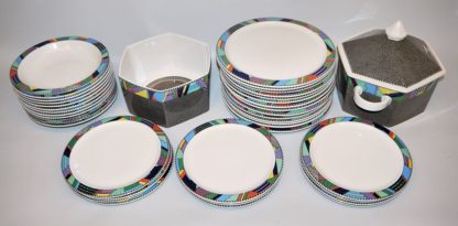 Speiseservice für mind. 12 Personen, 40-tlg., Entw. Barbara Brenner, *1939, 14 große Teller (Dm 27,5 cm), 12 kleinere Teller (Dm 22,5 cm), 12 Suppenteller, polygonale Schüssel und polygonale Deckel-Terrine, am Boden Relief- bzw. Stempelmarke, einige Teile sign.