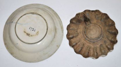 Großes Becken mit Bildmalerei im Spiegel, eine Szene aus der Sage um Golo und Genoveva mit zweizeiliger Texterläuterung, umseitig "1730", ein Brandriss beim Glasurbrand gebessert (Dm 42,5 cm) sowie eine Buckelschale mit Scharffeuerfarben in Grün, Gelb und Braun, im Spiegel ein Singvogel zwischen Pflanzen, umseitig unglasiert (36,5 cm)