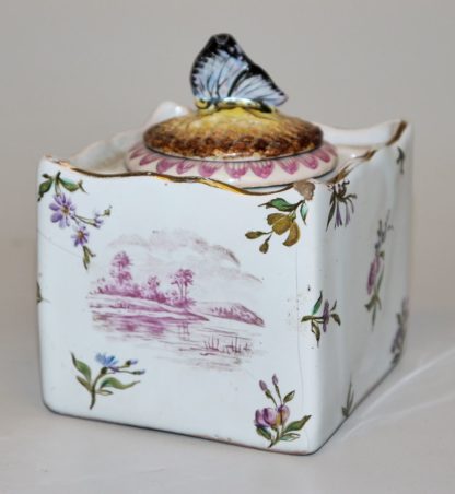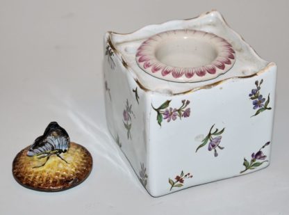 Quaderförmiges Tintenfass mit weißer Glasur und feiner Bemalung aus Blüten und einer Landschaft in Purpur-Camaieu, einliegend der Tintenbehälter und mit dem seltenen Deckel mit Knauf in Form eines Schmetterlings, kleiner Chip an den Flügeln abgedeckt, unterseitig von Hand signiert, 8,2 x 6,8 x 6,8 cm