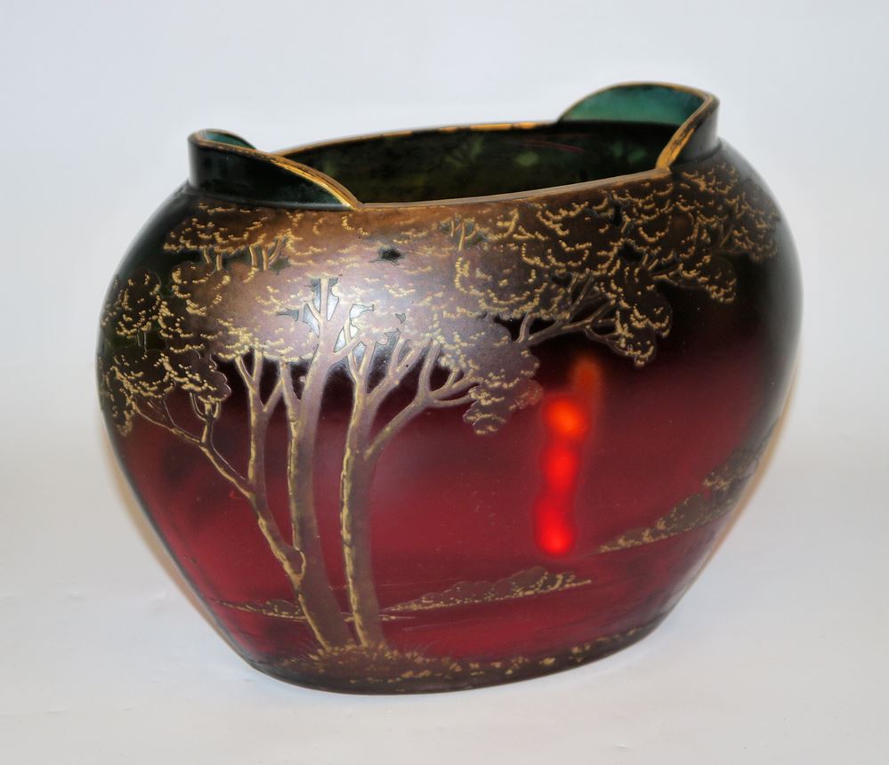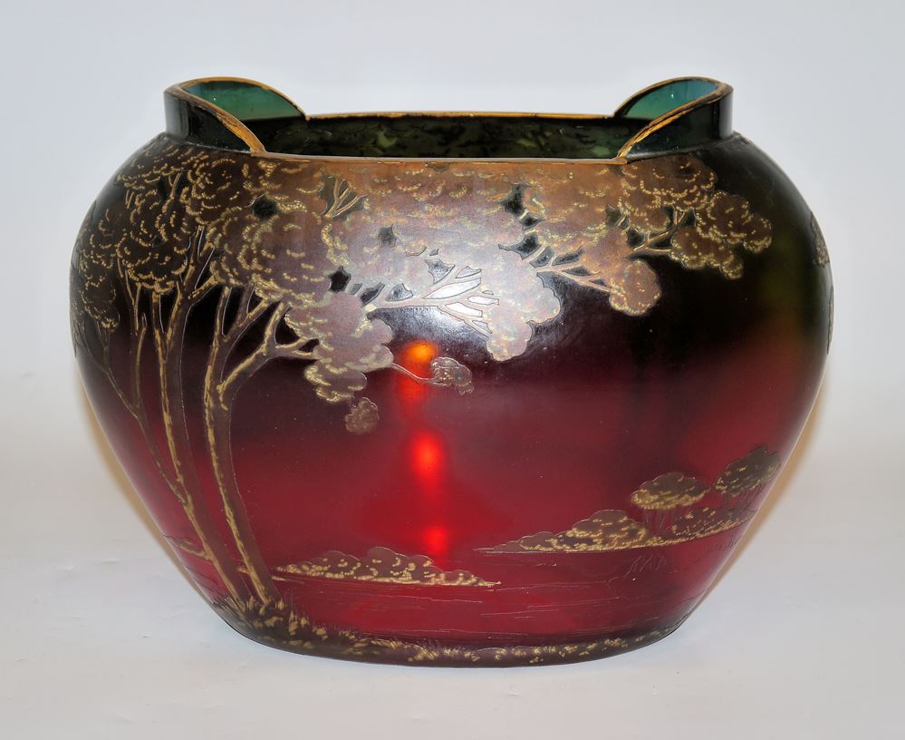 Maximilian Boudnik, Cameo-Glasvase, Antonienhütte, Ullersdorf bei Teplitz um 1910 Große Schalenvase aus Glas mit rubinrotem, blau verlaufendem Überfang, geätzter und goldgehöhter Dekor einer baumbestandenen Seelandschaft, irisiert, 19 x 26 x 15,5 cm