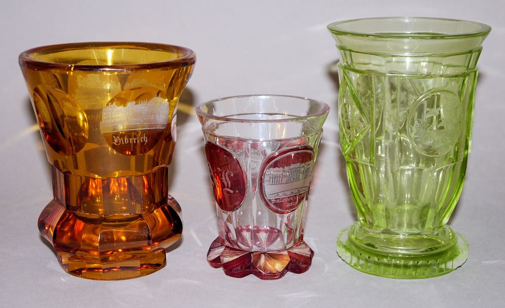 3 Ranftbecher, einmal farbloses Glas, bernsteinfarben lasiert, mit Ansichten von Biberach, Johannisberg, Bonn usw. im Mattschnitt, H 10,5 cm, einmal farbloses Glas, z.T. rubinrot lasiert, mit Ansichten von Baden-Baden, H 8 cm und einmal hellgrünes Glas, mit Enten und Jagdhund in Landschaften in Mattschnitt, H 11,5 cm