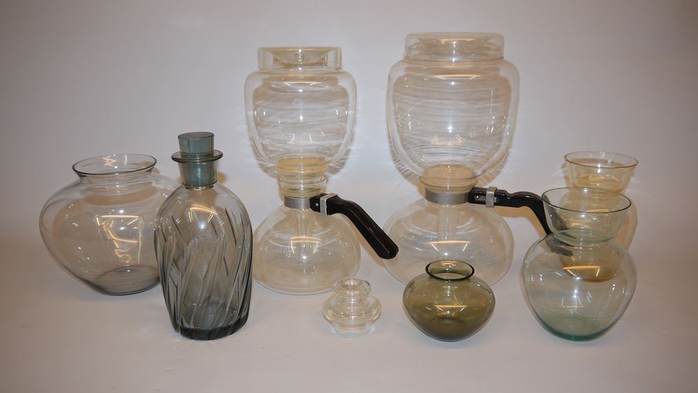 Zwei Kaffeemaschinen "Sintrax" aus Jenaer Glas von Schott, Mainz, beide die 1948 von Bruno Mauder weiterentwickelte Version des Erstentwurfs von Gerhard Marcks und Wagenfeld; die seltene Likörkaraffe "Eremit" von Wilhelm Wagenfeld, entworfen 1937 für die VLG Weißwasser (H 20,5 cm) sowie 4 Vasen nach Wagenfeld in unterschiedlichen Farbtönen (H 7-15 cm)