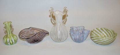 Fünf "Zanfirico"-Väschen und -Schalen, Murano ab 1950er Jahre "Fazzoletto", Taschentuchvase (H 6 cm), zwei Väschen mit Amphorenhenkeln (H 10 & 16 cm) sowie zwei Schalen mit gewelltem bzw. eingebogenem Rand (H 5 & 5,5 cm), alle dünnwandiges Glas mit Spiralfäden
