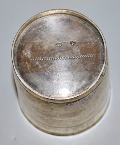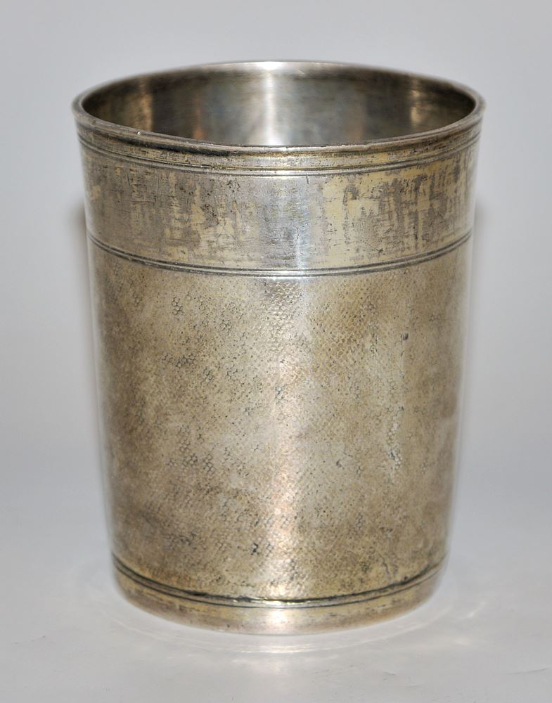 Schlangenhautbecher, Silber, Nürnberg, 17. Jh. Silber, rund, leicht konischer Korpus, H 8,7 cm, 143 g, Meisterzeichen Johann Höffler, Meister 1655, erwähnt bis 1695 bzw. 1700, Tremolierstrich, Nürnberger Beschauzeichen, 2. H. 17. Jh.