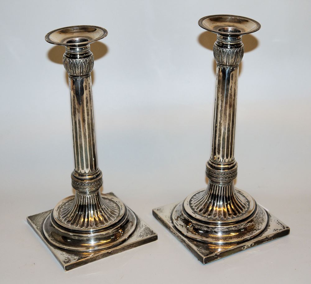 Silber, punziert, Marke für Importsilber zwischen 1814-1831, Schaft in Form einer Säule, mehrkantig, umlaufende Blattfriese, Fuß mit Zungenfries, auf festem quadratischem Sockel, H 25,5 cm, zus. ca. 736 g (ohne Holzfüllung)