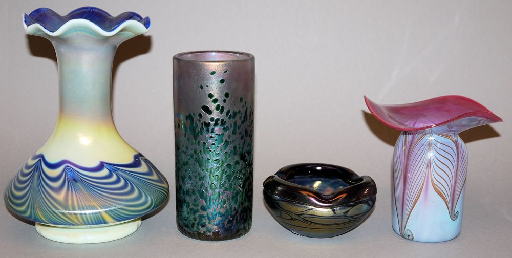 Vier Kunstglasvasen von Eisch und Malta Zwei Eisch-Vasen von 1977 und 1985, beide mit gekämmten Aufschmelzungen und irisierter Oberfläche (22,5 & 13,5 cm); Zylindervase, signiert "Phoenician Malta" (H 18,5 cm) und Schale in Art des Jugendstils, signiert "Mtarfa" (Dm 11,5 cm), beide aus Malta