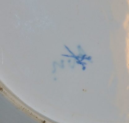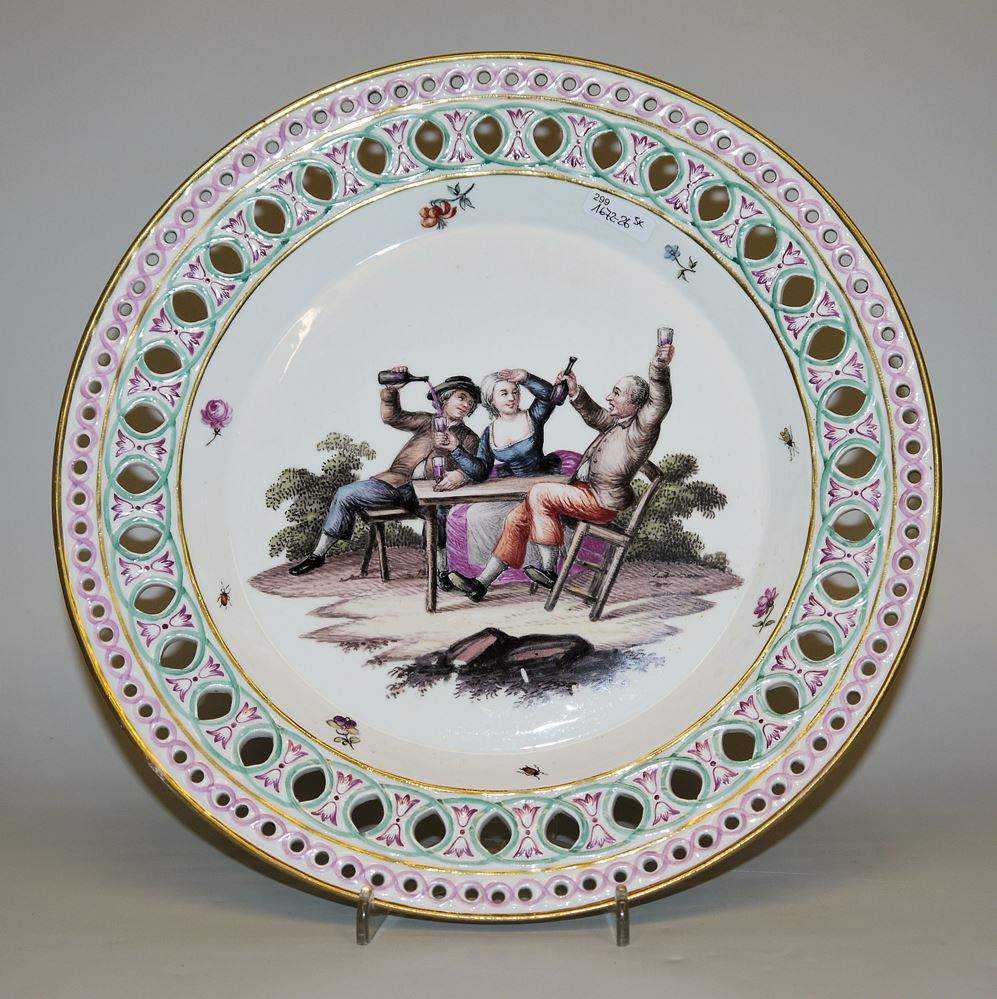 Gegenstücke zweier Porzellanfiguren einer Dame mit Vogelkäfig und Schäfchen sowie eines galanten jungen Mannes mit Hündchen, beide sitzend vor blühenden Bäumen und seitlich montierten Kerzenhaltern, geringe Verluste an Blütenblättern, ansonsten in gutem Zustand, rückseitig goldene Ankermarken, wohl Chelsea, H 25,5 cm dazu ein Porzellanteller mit durchbrochener Fahne, im Spiegel eine polychrom gemalte Genreszene trunkener Zecher, apokryphe Schwertermarke, wohl Paris, Dm 29,2 cm