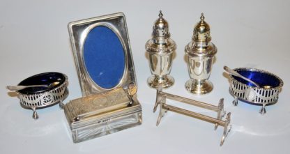 925er Silber, Rasierklingen-Behälter mit Glaskorpus aus Reise-Necessaire, William Neal, London 1852; 925er Silber, Paar Gewürzschälchen mit Glaseinsatz auf Ball-and-Claw-Füßen, Sibray, Hall & Co., London 1903, dazu kl. Augsburger Faden-Löffel, 800er Silber; 925er Silber, Salz- und Pfeffer-Streuer, Gorham; 800we Silber, paar Messerbänkchen des Jugendstils; 800er Silber, Standrahmen, 11 x 8 cm, mind. 250 g Silber