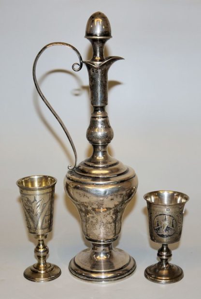 Zwei Wodkabecher, Silber, Russland 1894-1908, einmal Moskau & Silber-Kanne, Tschechoslowakei, 1921-28 Zwei gefußte Becher, 84 Zolotniki, punziert 1896-1908, nachpunziert 1927-58, ungedeutete Meistermarke IEZ, ziseliert mit Architektur in dreieckigen Feldern, H 9,5 cm und gefußter Becher, punziert Moskau Beschaumeister ?.S, wohl 1894, Meistermarke MD, fein ziseliert, in runden Medaillons Architektur, H 8 cm; Zierliche balusterförmige Stöpselkanne mit profiliertem Hals und Volutenhenkel, 800er Silber, punziert, Meistermarke K.M., H 25 cm, zus. 280 g