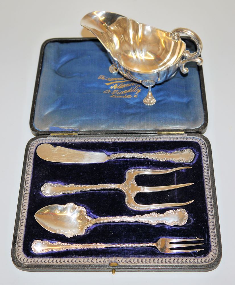 0798-4 Teile Servierbesteck, Sheffield, Henry Wilkinson 1900-1903 in Original-Schatulle & Silber-Sauciere, London 1932