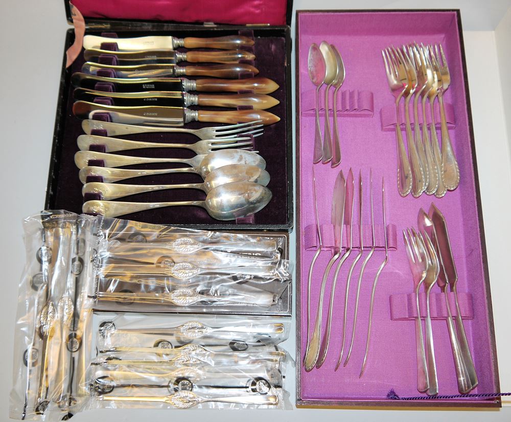 Silber-Fischbesteck für 6 Personen, Wilhelm Binder, 12 Hummergabeln, Wilkens & Restbesteck, Kofmehl/Frankreich um 1900 800er Silber: 6 Fischgabeln, 6 Fischmesser, dazu 2 weitere Fischgabeln und -messer, 12 Hummergabeln, unbenutzt, in Original-Verpackung, dazu 3 Tafelgabeln, 3 Suppenlöffel, zus. 1440 g, 750er Silber: 3 Kaffeelöffel, 74 g, dazu 6 Tafelmesser mit Horngriffen um 1900