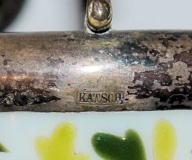Gürtelschließe mit Niello, Silber, Kiew, 1908-17 & paar Gewürzschalen, Glas/versilbert, Alex Katsch, Russland um 1900 Gürtelschließe, 84 Zolotniki Silber, mit feinem Niello-Dekor, guillochiert, 7,5 x 7 cm, 30 g, dazu paar Milchglas-Schälchen mit Blumen in Emaillemalerei, Montur und Henkel versilbert, Dm 5,8 cm, gemarkt Katsch, Alexander Kach (Katsch) St. Petersburg (1865-1915)