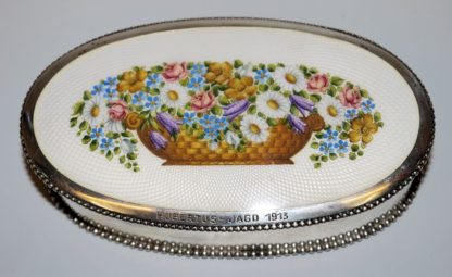 Georg Adam Scheid, 1837-1921, ovale Dose mit Perlenrand und Innenvergoldung, der gewölbte Deckel emailliert mit einem Blütenkorb vor weißem Fond, am Rand graviert "Hubertus-Jagd 1913", im Deckel Dianakopf im Hexagon für 900er Silber, Stadtbuchstabe A für Wien und Meistermarke G.A.S., der Dosenboden zusätzlich undeutlich punziert mit einem Aachener Vertrieb, Zustand einwandfrei, 294 g, 4,3 x 14 x 7,9 cm