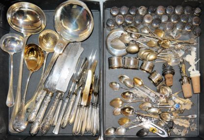 Sammlung Restbestecke, Andenkenlöffel, Salz & Pfeffer-Streuer, Flaschenstopfen usw., Silber ab spätem 19. Jh. 12er Lot: großer Suppenschöpfer Augsburger Faden, 178 g; 925er Silber: 24 Salz& Pfeffer-Streuer aus Glas mit Silber-Deckel, runder Ascher, Mexiko, zahlreiche Andenkenlöffel, dabei auch Serviergäbelchen), zus. mind. 258 g; 830er Silber: 4 Dessertgabeln und 4 Dessertmesser; 800er Silber: Schöpfkelle, Saucenlöffel, Bratenbesteck und Servierbestecke (Griffe gefüllt), 4 Serviettenringe, Buchmarker, zahlreiche Andenkenlöffel aus aller Welt, 2 figürliche Flaschenstopfen, zus. mind. 686 g