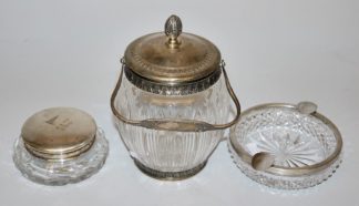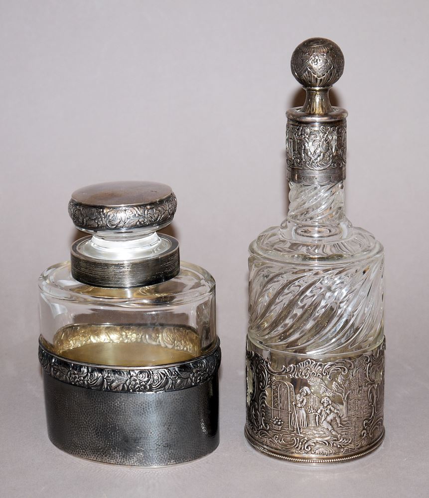 Stöpselkaraffe, runder Korpus mit abgesetzter Schulter und schlankem Hals, farbloses Glas, Manschette, Stöpsel und Montur aus 925er Silber, fein durchbrochen mit figürlicher Reliefzier, punziert, Rabenkopf in Wappen?, wohl Freiburg, Meistermarke DK, H 22 cm; Stöpselkaraffe, farbloses Glas, Korpus mit ovalem Querschnitt, Montur, Manschette und Stöpsel mit 800er Silber, punziert, Martin Mayer, Mainz, H 14 cm