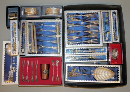 800er Silber, 6 Kuchengabeln, Sahnelöffel, Zuckerzange. Kuchenheber, 4 Serviergabeln, 6 + 1 Cocktail-Gäbelchen mit Becher, 4 Serviettenringe Gebr. Reiner, alle in Original-Verpackungen, unbenutzt, zus. 463 g, dazu 4 Farb-Kugelschreiber 900er Silber, unbenutzt, aus Juweliers-Nachlass