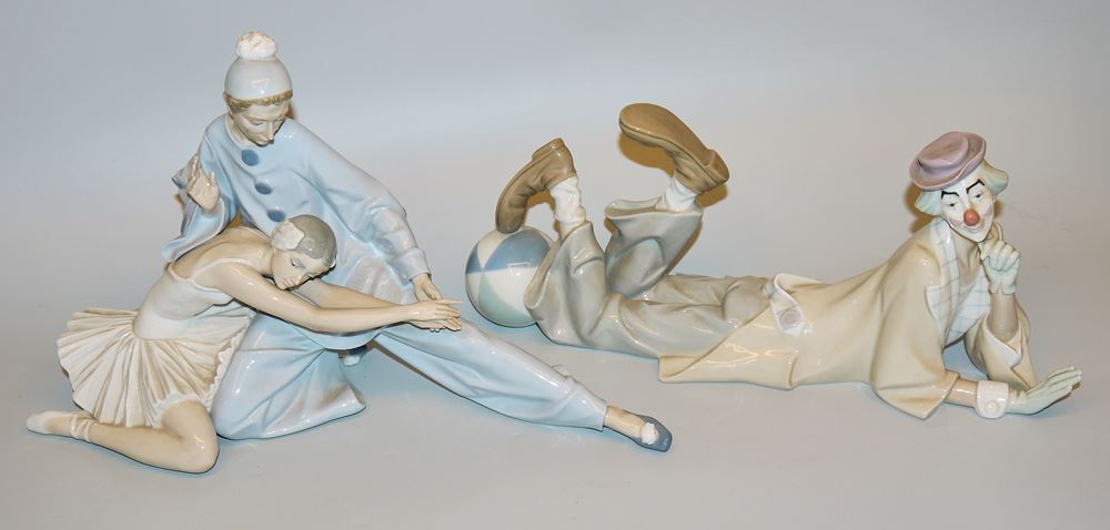 Entwurf Salvador Furio, Pierrot und Ballerina, H 23,5 cm und Clown mit Wasserball, H 17 cm, beide in Pastellfarben staffiert, beide einwandfrei