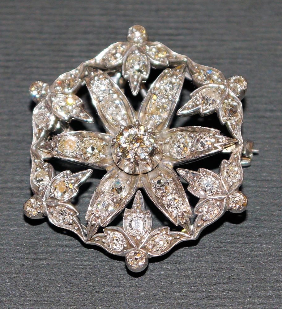 Diamant-Anhänger-/Brosche, Gold, um 1900/20 14kt Weißgold, blütenförmig, polygonale Fassung, besetzt mit 35 Altschliff-Diamanten von zus. ca. 4,00 ct, dabei 1 x ca. 0,5 ct, 13 x ca. 0,15 ct usw., 13,16 g
