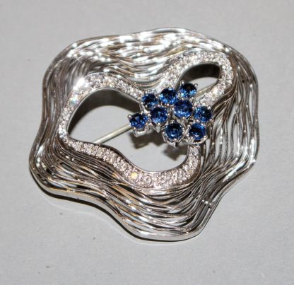 18kt Weißgold, besetzt mit 34 Brillanten von zus. ca. 0,80-0,88 ct und 9 blauen Saphiren, 12,86 g, B 4,5 cm