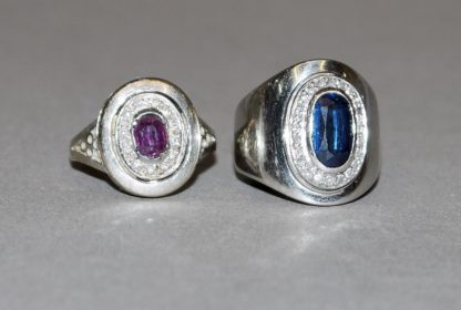 14kt Weißgold, besetzt mit einem längsovalen blauen Saphir, umfasst von 24 kleinen Brillanten, 8,68 g, Gr. 49; 18kt Weißgold, gepr., besetzt mit einem ovalen Rubin, umfasst von 12 kleinen Brillanten, 4,06 g, Schiene mit Riss, Gr. 51