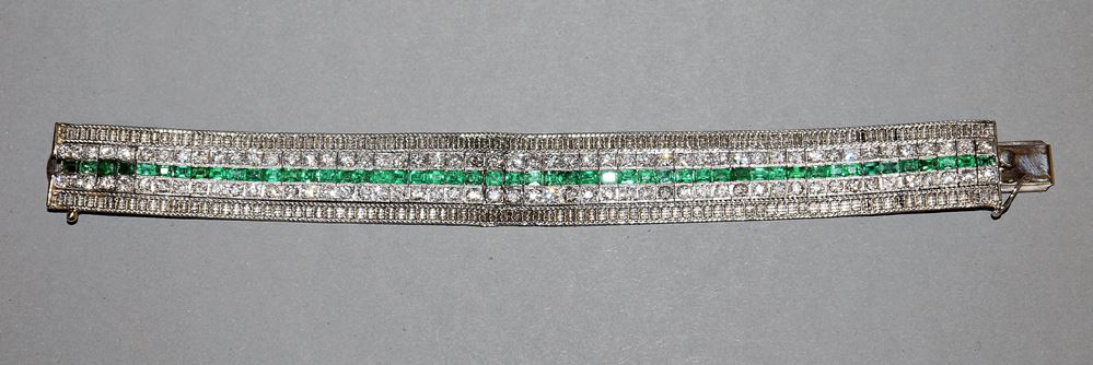 14kt Weißgold, besetzt mit 102 Brillanten von zus. ca. 8,16 ct und 50 Smaragden in Smaragd-Schliff, Sicherheitsschließe, 48,04 g, mittig Reparaturstelle, wurde gelötet und Steine ersetzt, L 18,5 cm