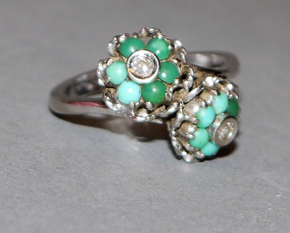 18kt Weißgold, in Form von 2 Blüten, besetzt mit 2 Brillanten und 12 kleinen Türkisen, 5,04 g, Gr. 52