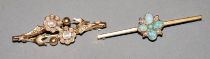 Beide 14kt Gelbgold, einmal Stabbrosche, besetzt mit 5 Opalen und 3 kleinen Perlchen (einmal zu ergänzen), einmal Blütenbrosche besetzt mit Mabe-Perlen und kleinen Perlchen, zus. 8,13 g