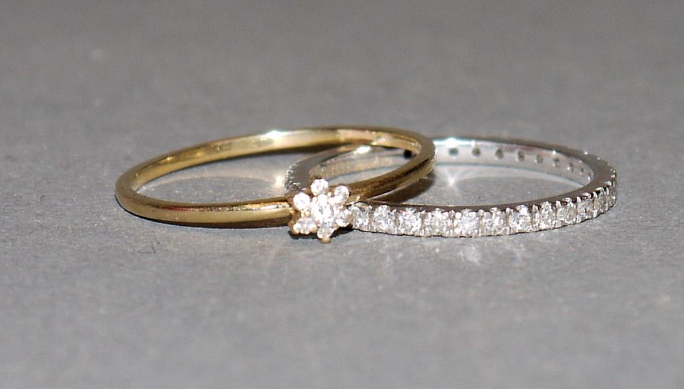 Alliance-Ring, 18kt Weißgold, besetzt mit ca. 33 Brillanten, 1,56 g, Gr. 53; Vorsteckring, 14kt Gelbgold, besetzt mit 7 Brillanten in Rosettenform, 0,93 g, Gr. 55