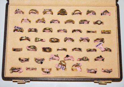 14kt Gelbgold: Ring, 1,42 g; 9kt: 2 Ringe, besetzt mit Zirkonia, zus. 3,43 g; 8kt Gelb-und Weißgold: 45 Ringe, besetzt mit Brillanten von zus. ca. 0,368ct (Angabe auf Etiketten), Saphiren, Rubinen, 1 x Aquamarin, Zirkone usw., zus. 73,61 g, mit Original-Etiketten (Etiketten-Gewicht abgezogen), aus Juwelier-Nachlass, in Verkaufs-Schatulle