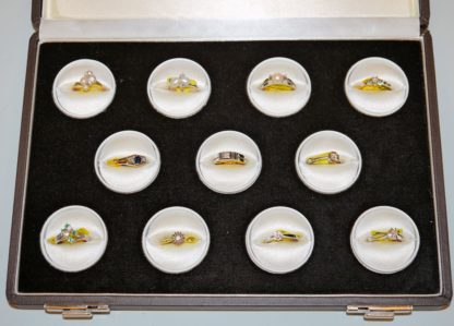 11 Ringe mit Brillanten, Smaragden, Perlen und Saphir, Gold 18kt Weißgold: Solitaire, besetzt mit einem Brillant von 0,15ct pi, 2,58 g; 14kt Gelb- und Weißgold: 10 Ringe, besetzt mit Brillanten von zus. ca. 1,00 ct (dabei 2 x Solitaire mit 0,20ct vs/tw. und wp 1), 4 Smaragden, einem blauen Saphir, einer Zuchtperle uns div. Süßwasserperlen, zus. 30,90 g, mit Original-Etiketten (Etiketten-Gewicht abgezogen), aus Juwelier-Nachlass, in Verkaufs-Schatulle
